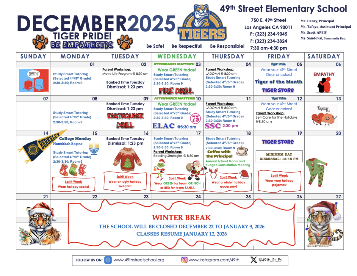 December Calendar Attached is the 49th Street December calendar! 🎄*****¡Adjunto está el calendario de diciembre de la escuela 49! 🎅🏼